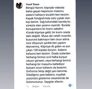 15 Temmuz darbe girişimi sonrası köprüde bir askerin kafasını kestiğini yazan Yusuf Tosun adlı kişi, daha sonra “Ben kimsenin kafasını kesmedim” diyerek sözlerini yalanladı. Tosun’un paylaşımları sosyal medyada gündem oldu.