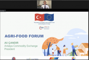 Antalya Ticaret Borsası Yönetim Kurulu Başkanı Ali Çandır, Türkiye Odalar ve Borsalar Birliği (TOBB) ile Avrupa Ticaret ve Sanayi Odaları Birliği (EUROCHAMBRES) işbirliğinde yürütülen Türkiye AB İş Dünyası Diyaloğu Projesi kapsamında düzenlenen “Tarım ve Gıda Forumu”na katıldı. EUROCHAMBRES TEBD Takım Lideri ve Proje Direktörü Oya Ersöz’ün moderatörlüğünde gerçekleşen “Tarımsal Gıda Ekosisteminin İhtiyaçları ve Fırsatları” başlıklı oturumda konuşan Çandır, Antalya’nın tarımsal potansiyeli ve yatırım fırsatlarını anlatırken, Borsa’nın proje ve çalışmaları hakkında bilgi verdi.