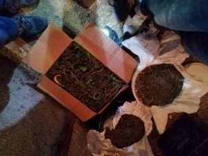 H.K.’nın evinde, evin eklentilerinde ve bahçesinde yapılan aramada bahçedeki arı kovanının içinde yaklaşık 2 kilogram kubar esrar ve tohumu, ahırda karton koli içinde yaklaşık 4 kilogram kubar esrar ve iki adet plastik boya kovası içerisinde yaklaşık 8 kilogram kubar esrar olmak üzere toplam 14 kilogram kubar esrar ele geçirildi. Aramalarda ayrıca 1 adet ruhsatsız av tüfeği ve 2 adet kuru sıkı tabanca bulundu. Şüpheli H.K. gözaltına alındı.