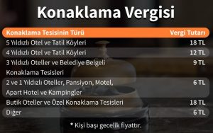 Konaklama vergisi konaklama tesisinin türüne göre ve kişi başına gecelik olarak hesaplanacak. Yeni düzenlemeye göre 5 yıldızlı otel ve tatil köyleri ile butik otel ve özel konaklama tesislerinde kalanlar kişi başına her bir gece için 18 TL konaklama vergisi ödeyecek.