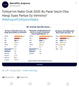 Stratejik ve sosyal araştırmalar yapan araştırma kuruluşu MetroPOLL, ” Türkiye’nin Nabzı Ocak 2020″ başlıklı anket sonuçları yayınlandı.