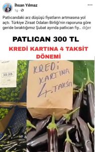 Bir meslektaşımın, ‘‘Patlıcanın kilosu 300 lira’’ diye paylaşımını gördüm. Fotoğraf düzmece olabilir mi diye Türkiye’yi aradım. ‘‘Doğrudur, pazarda 200 liranın üzerindeydi’’ dediler.