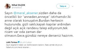 “Sayın @meral_aksener, sizden daha da öncelikli bir “anneden, anneye” istirhamdır. İki anne olarak konuşalım. Burdan herkesin huzurunda, gizli saklı,kapalı kapılar ardından değil açık açık randevu talep ediyorum, tek ricam var oda zaman dar olmasın. Gece, gündüz nereye derseniz hazırım.”