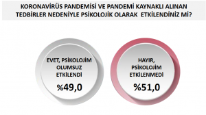 Pandemi, hem Türkiye hem de Muratpaşa ölçeğinde her iki kişiden birinin psikolojisinin olumsuz etkiledi. Buna karşın Türkiye ölçeğinde psikolojik destek aldığını söyleyenler ancak yüzde 9.9 olurken Muratpaşa için bu oran yüzde 13.6 olarak gerçekleşti. Ankete katılan her iki kişiden biri artık ‘hayata daha olumsuz baktığını’ söylerken daha olumlu baktığını dile getirenlerin oranı yüzde 19.9, değişmediğini dile getirenlerin oranı da yüzde 30 oldu.